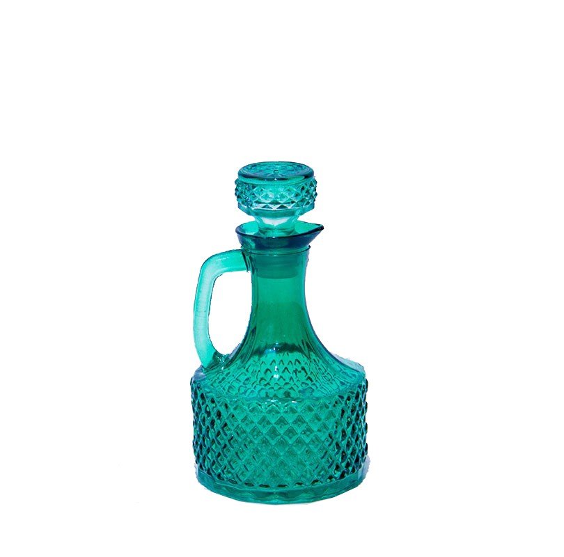 Garrafa de vidro decorativa em tamanho pequeno, disponível em quatro cores. Este modelo em Verde.
